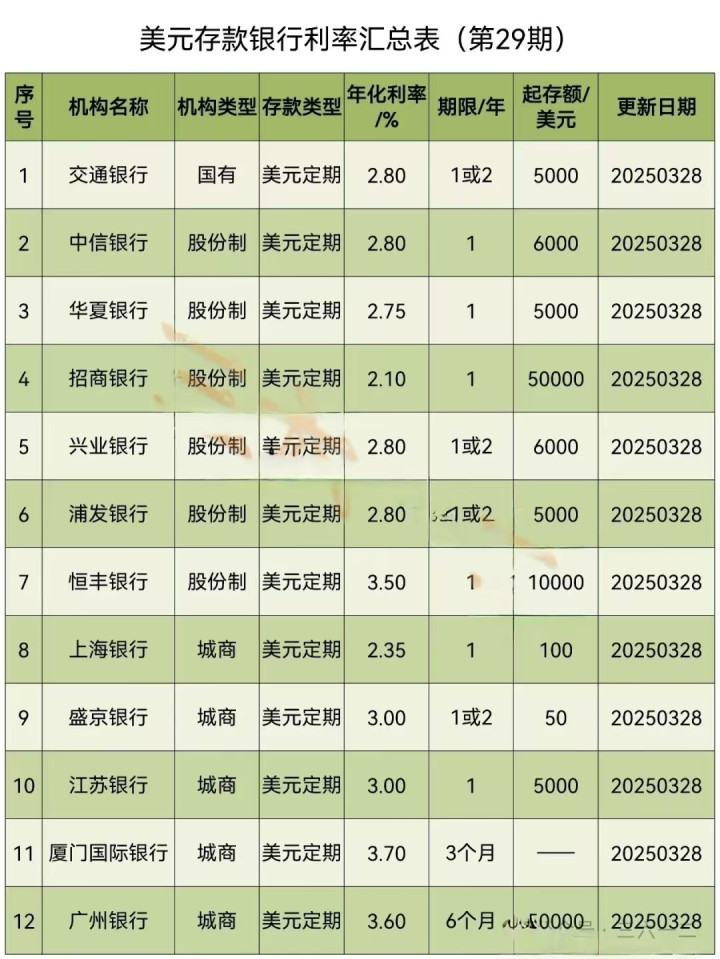 在2025年3月初,当时人民币对美元的汇率大约是在7.33,当时如果有人存入10万美元(折合人民币73.3万)的存款,利率3.5%,理论上一年就可以获得3500美元的利息,按照当时的汇率计算,大约是25700元,这个利息要比人民币存款多出5000元以上。