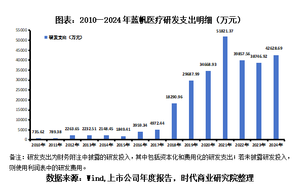 年报显示,蓝帆医疗的研发支出在2018—2021年从1.83亿元逐年增长至5.18亿元,2022—2024年则每年稳定在3.87亿元及以上。