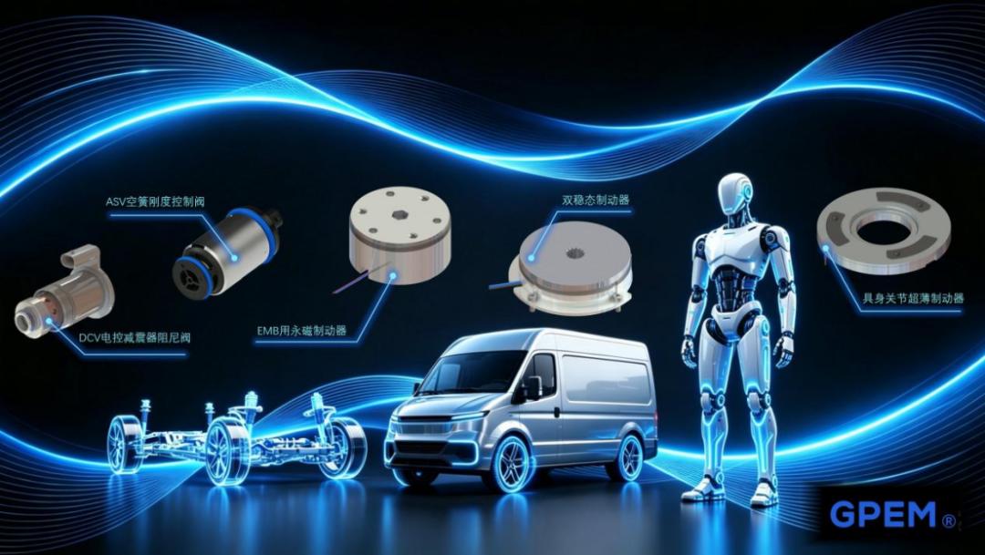 在既有技术积累与本土化正向研发能力的基础上,极湃电磁正加速拓展产品版图,当前重点布局两条核心产品线和四大应用场景:用于主动悬架的电控减震器阻尼控制阀(DCV)和空气弹簧刚度切换阀(ASV)、用于线控制动(EMB)的永磁制动器以及面向具身智能机器人的关节模组制动器(PMB)。