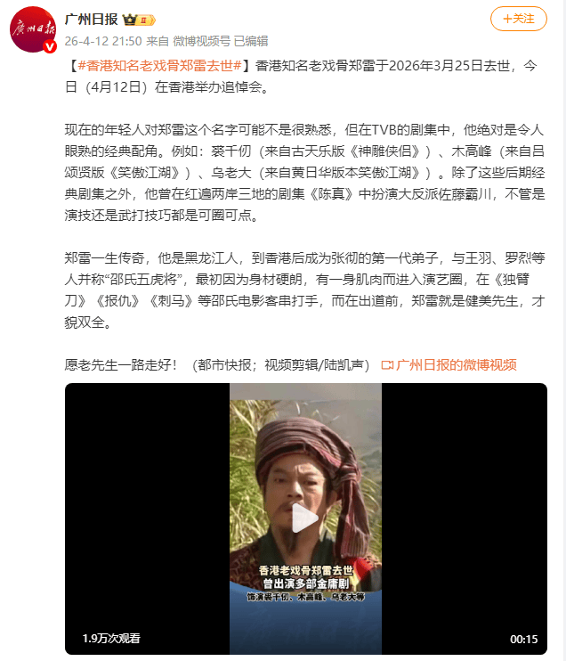 香港知名老戏骨郑雷于2026年3月25日去世,今日(4月12日)在香港举办追悼会。